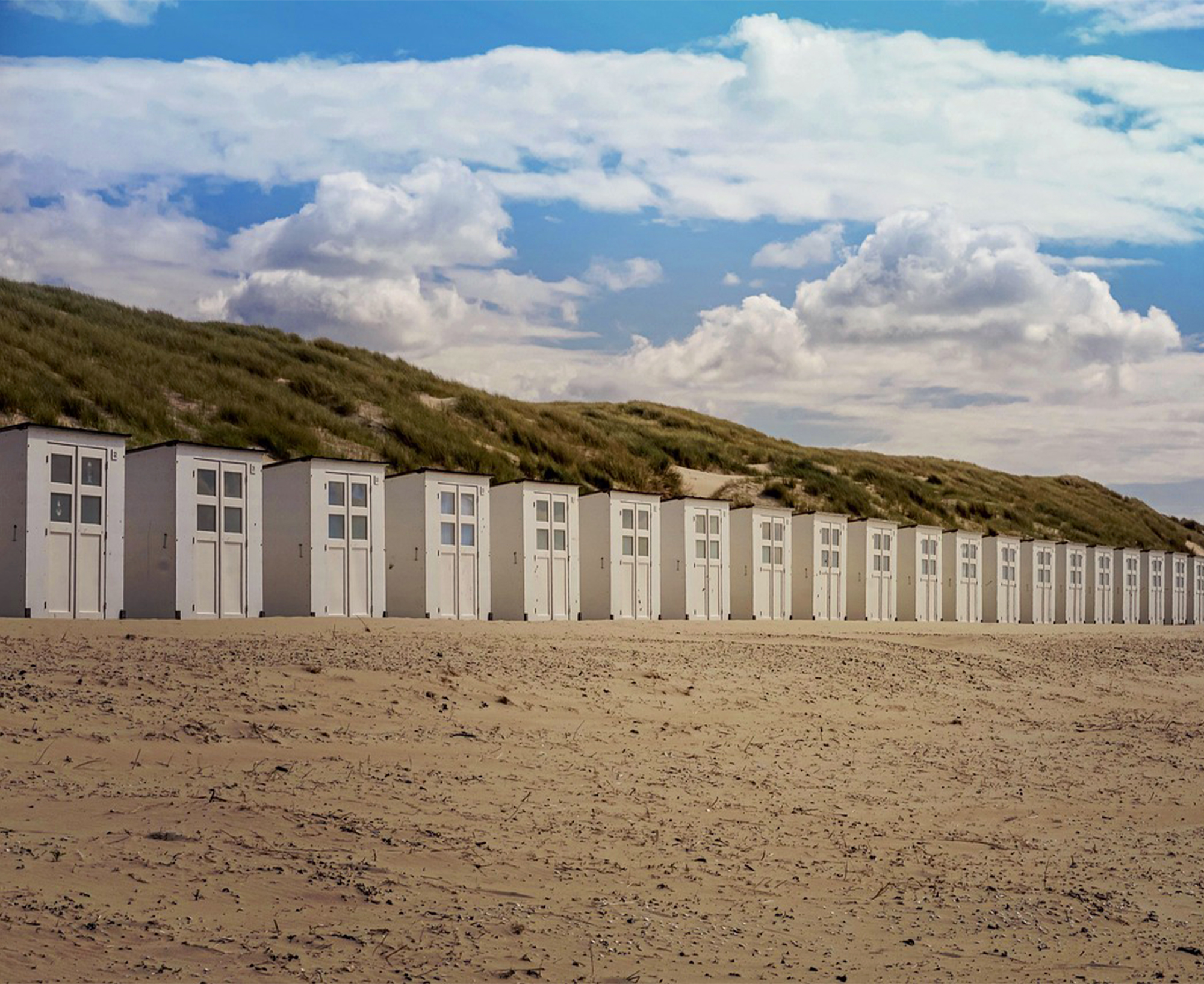 Blokhus store brede sandstrand med de ikoniske hvide badehuse og hav så langt øjet rækker (2,5 km)